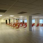 The section to left includes an entrance lobby and large main hall, which includes laminate flooring and suspended ceiling.